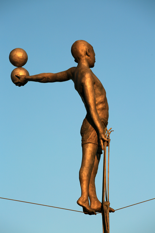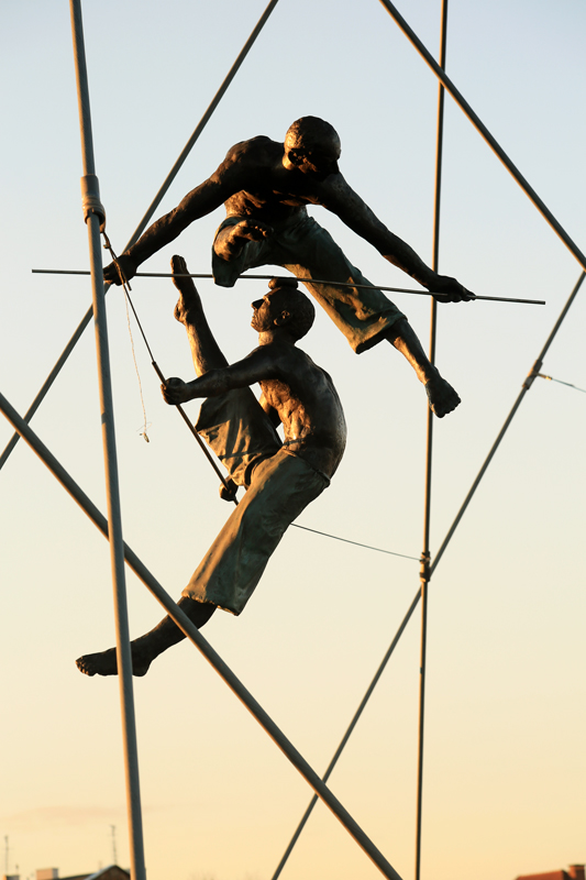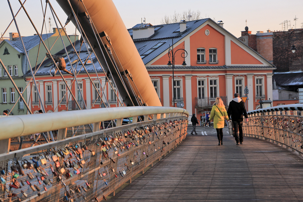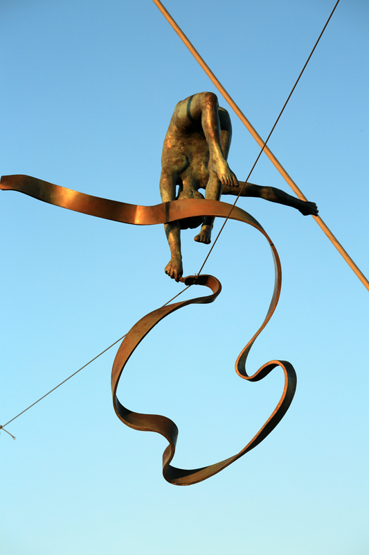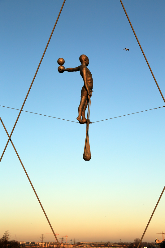 W każdym razie po bardzo udanym fotograficznie zajechaliśmy do Krakowa ok. 13.00. Udaliśmy się nad bulwary wiślane w oczekiwaniu na zachód słońca. Wykonałem kilka kadrów z kładki o. Bernatki. To właśnie na niej zainstalowano na linach i prętach 9 figur akrobatów światowej sławy rzeźbiarza – Jerzego Kędziory. Wystawa pod nazwą „Między wodą a niebem” jest efektem europejskiego projektu w ramach którego dzieła ukazane w przestrzeni publicznej w wyjątkowy sposób. Z rzeźbami zetknąłem się więc przypadkowo, ale zrobiły one na mnie ciekawe wrażenie. Szczególnie na tle zachodzącego słońca.