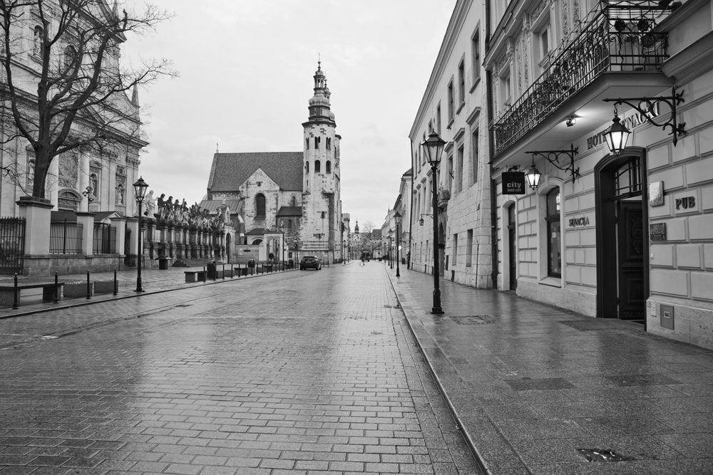 Następnie po zachodzie słońca kierowaliśmy się w stronę Rynku. Zamierzałem bowiem sfotografować miasto wieczorną porą. Wyznaczyłem sobie na tę podróż 3 cele fotograficzne w kontekście Krakowa: 1. białe dorożki wieczorem, 2. dzielnica Kazimierz tuż po zmroku, 3. Zamek Królewski o wschodzie słońca. Zanim przejdę do omówienia tych celów i powiadomienia o tym czy udało mi się je zrealizować, to na chwilę „zatrzymam się” przy ulicy Grodzkiej. Muszę przyznać, że zauroczyła mnie ona najbardziej podczas tej wizyty w Krakowie i powracałem do niej często. Tak prezentowała się po zachodzie słońca.
