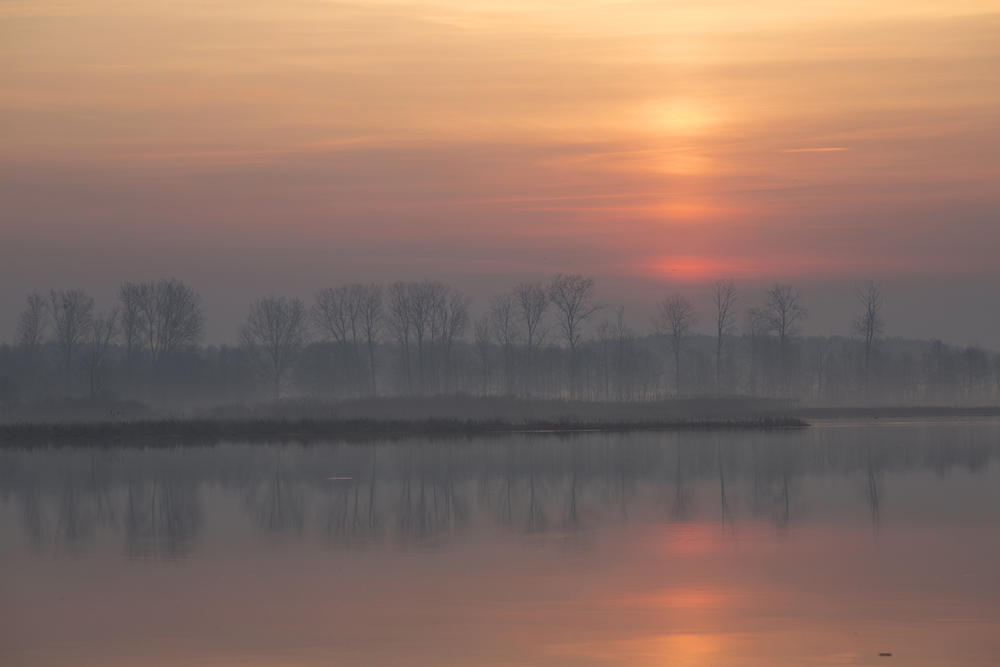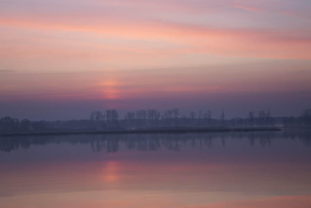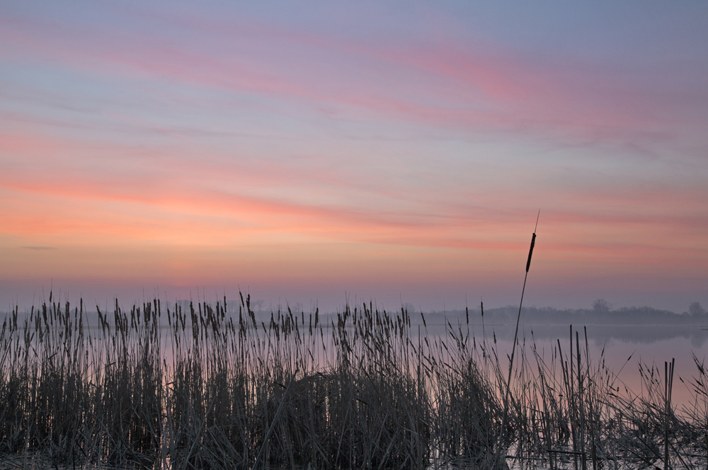 Dlaczego? Ponieważ wschód słońca był interesujący. Tak jak tydzień temu, teraz również fotografowałem wspólnie z przyjaciółmi z naszej grupy fotograficznej. Po czwartej rano wyjechałem i udało mi się dotrzeć na miejsce kwadrans po piątej. Nie musiałem długo chodzić i sprawdzać czy miejscówka przypadnie mi do gustu i czy będzie ciekawa, bowiem tuż po wyjściu z samochodu natrafiłem na małą łódkę, stary pomost, trzciny. Naprzeciwko kilka małych „wysepek”. Wszystko to tworzyło bardzo ładną całość. Widziałem też, że słońce delikatnie kreśliło już kolory na niebie. To napawało mnie optymizmem, że jak wstanie na dobre, to może odsłoni dzień w jakiś imponujący sposób – czyli będzie wyraziste, czerwone… To pozostawało pod znakiem zapytania.