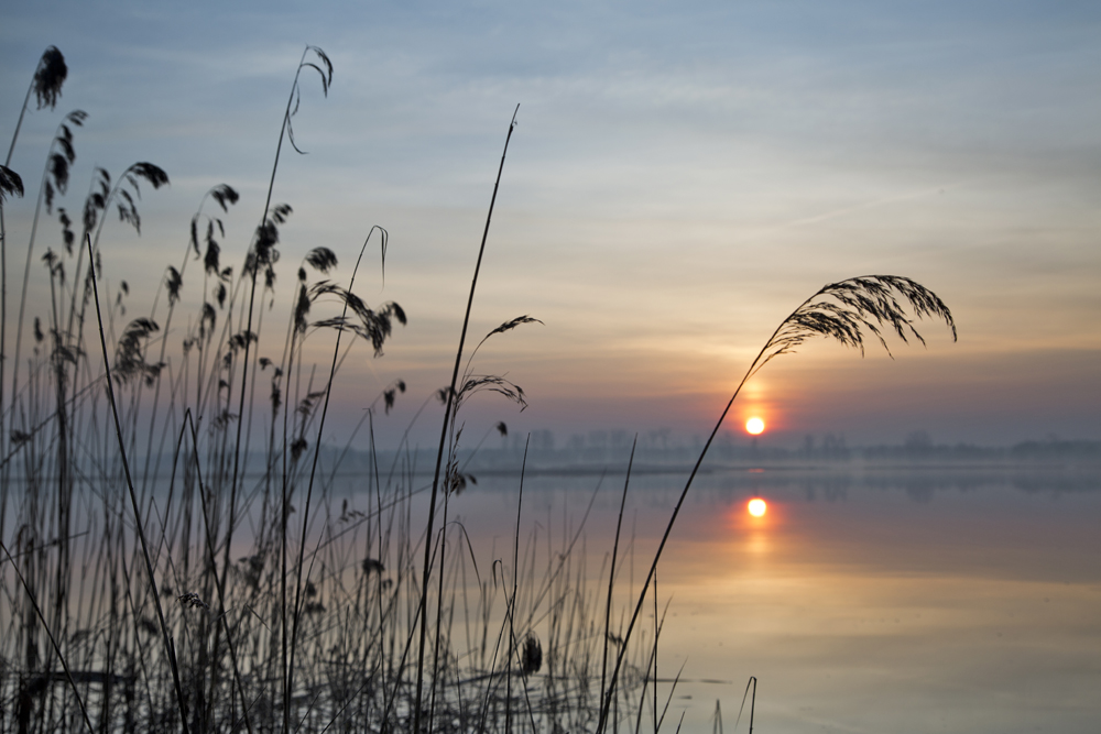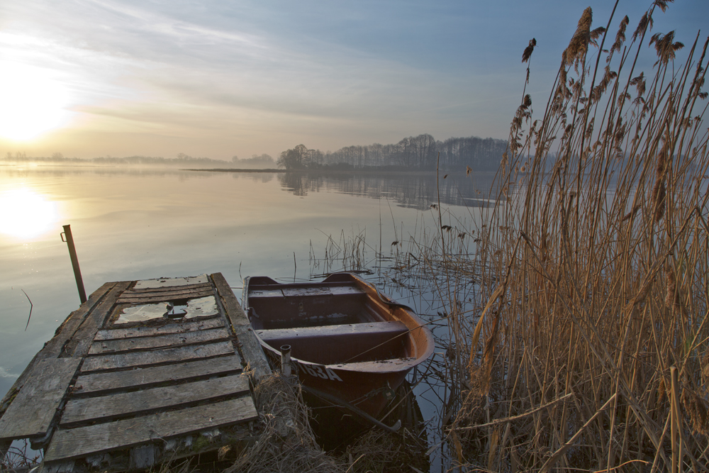 Kiedy już wiedziałem, że mam przynajmniej kilka zdjęć tego wschodzącego słońca na spokojnie już przeszedłem w inne miejsce, aby wykonać jeszcze jakieś kadry. Na zakończenie powróciłem do „punktu początkowego” i ponownie sfotografowałem łódkę. Spodobało mi się bowiem, że słońce tak mocną ją rozświetla wraz z trzcinami, trawami, które znajdowały się wokoło niej.
