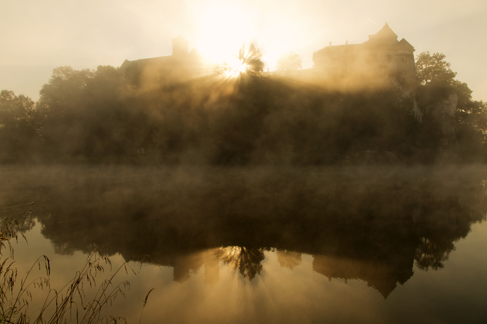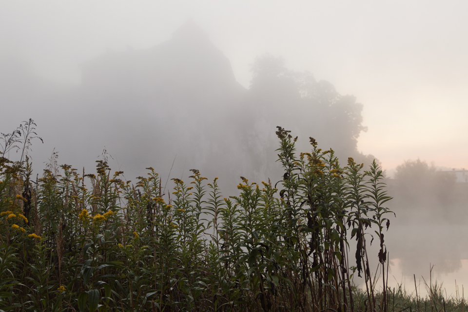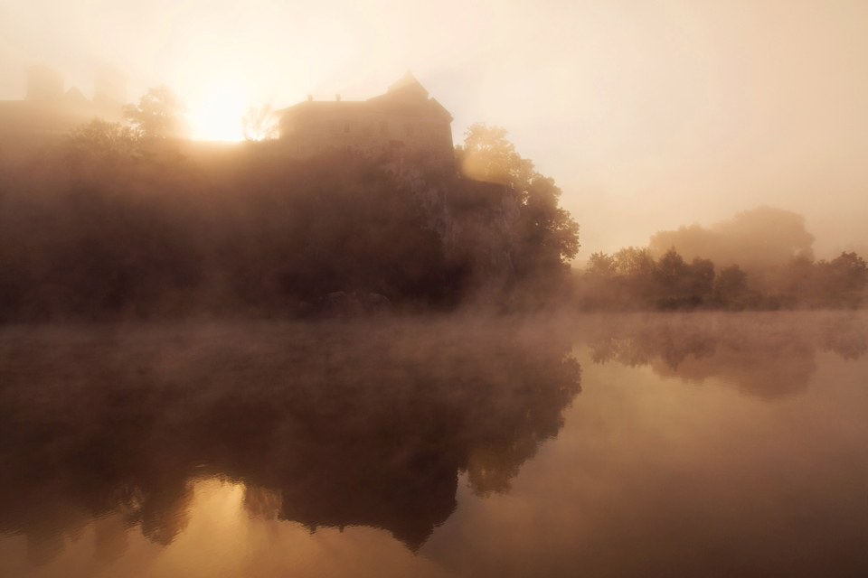 Jak widać, mgła była spora. W zasadzie na początku to ledwo można było zauważyć Wisłę. Cóż – takie warunki lubię. Z niecierpliwością wyczekiwałem na to co stanie się później. Tymczasem słońce przebijało się przez chmury i odkrywało delikatnie mury klasztoru…