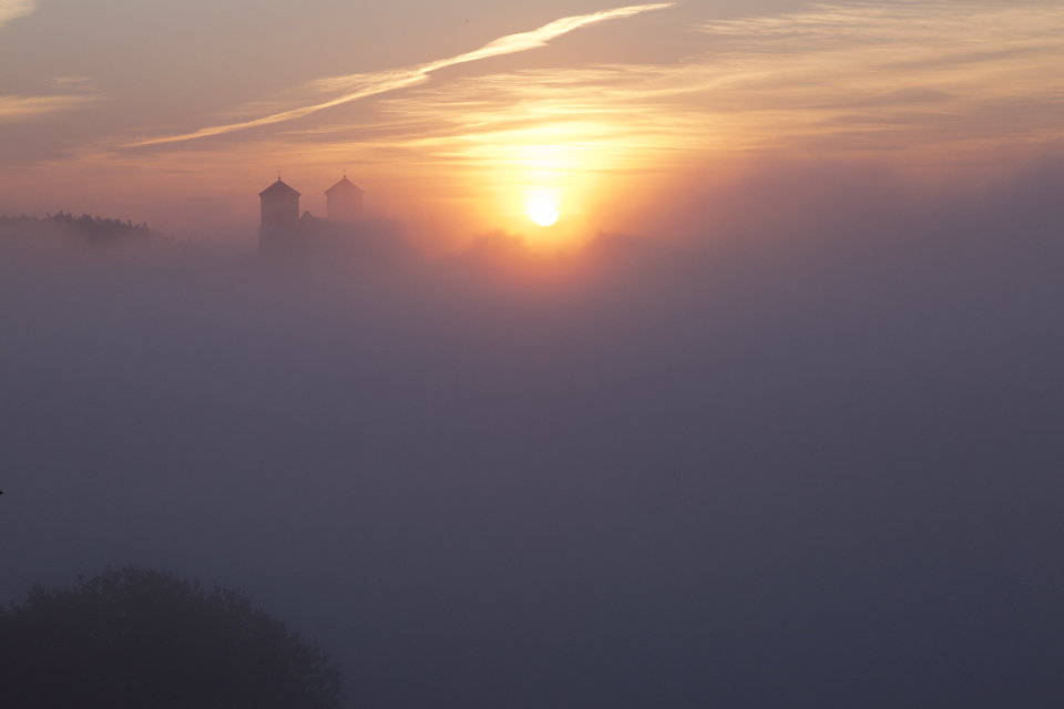 Zadzwonił Grzesiek, że znalazł ciekawy punkt widokowy z którego widać łąki zasnute mgłą. Wytłumaczył mi w którym miejscu znajduje się. Postanowiłem ruszyć i zobaczyć jak miasto prezentuje się z góry. W zasadzie mówiąc szczerze, to biegłem ze statywem przez mokre łąki mając świadomość, że słońce szybko wschodzi… Że często jest to 5-10. minut kiedy można wykonać ciekawe ujęcia. Kiedy wbiegałem na wzgórze zauważyłem wspaniałe kolory słońca. Myślę, że gdybym był ok. 5 minut wcześniej, kadry byłyby jeszcze lepsze. A tak robiłem je trochę w pośpiechu mając świadomość, że to jest ten moment. Ta chwila, która już się nie powtórzy prędko. Być może nigdy… Wiadomo bowiem, że do Tyńca mam ok. 400 km, więc nie mam możliwości by co tydzień jechać na wschód słońca 😉 W każdym razie rozstawiłem statyw, wziąłem mój teleobiektyw i zacząłem fotografować wschodzące nad klasztorem słońce… Co ciekawe – mgła przysłoniła praktycznie wszystko z wyjątkiem wież.