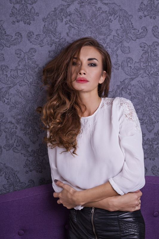 Po tej serii nadszedł czas na zmianę kreacji. Ale nie tylko. Zmieniliśmy bowiem również lokalizację. To znaczy postanowiliśmy wykonać kadry w drugim z pokojów. Wykorzystaliśmy ciekawe tło w postaci tapety. Udało się również zrobić kilka ciekawych zdjęć z łóżkiem w tle – tu dla odmiany było wąskie, a główną kolorystykę stanowił fiolet. Jeśli chodzi o kreacje, to najbardziej pasowało nam połączenie białej koszulki z czarną skórzaną spódnicą.