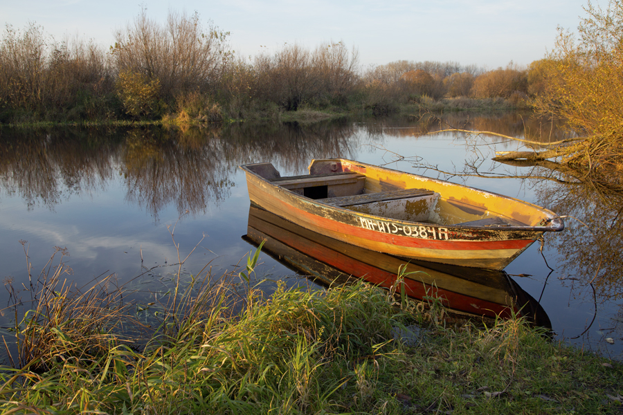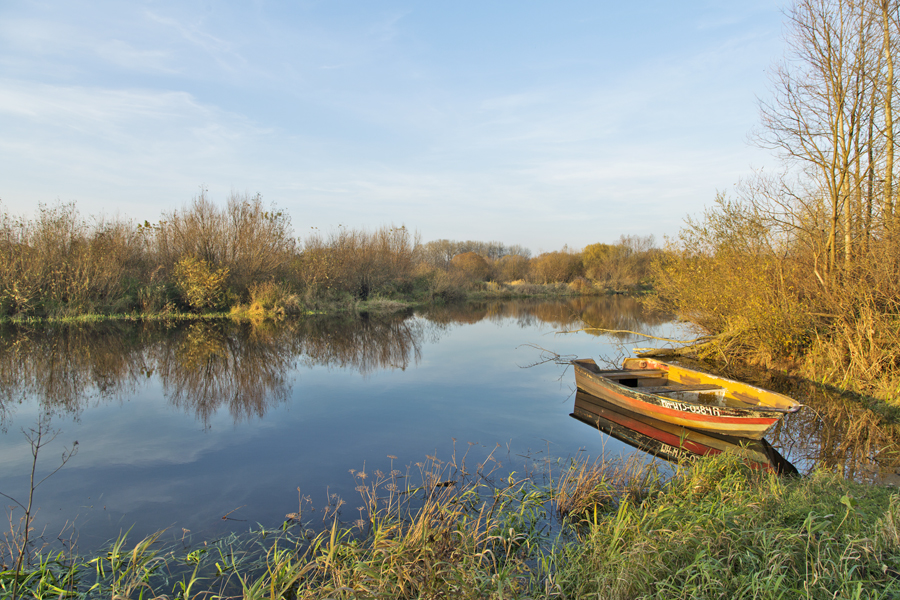 Nigdy nie byłem jesienią w Drogoszewie. Byłem więc tym bardziej ciekawy jak miejsce zaprezentuje się o tej porze roku. Kiedy zajechałem słońce rozświetlało łódkę, która znajdowała się w starorzeczu Bugu. Co ciekawe, wskutek wiatru delikatnie przesuwała się ona w bok, więc dzięki temu miałem różne kadry. Promienie słońca padały również na roślinność i drzewa. Błękit nieba odbijał się w wodzie.