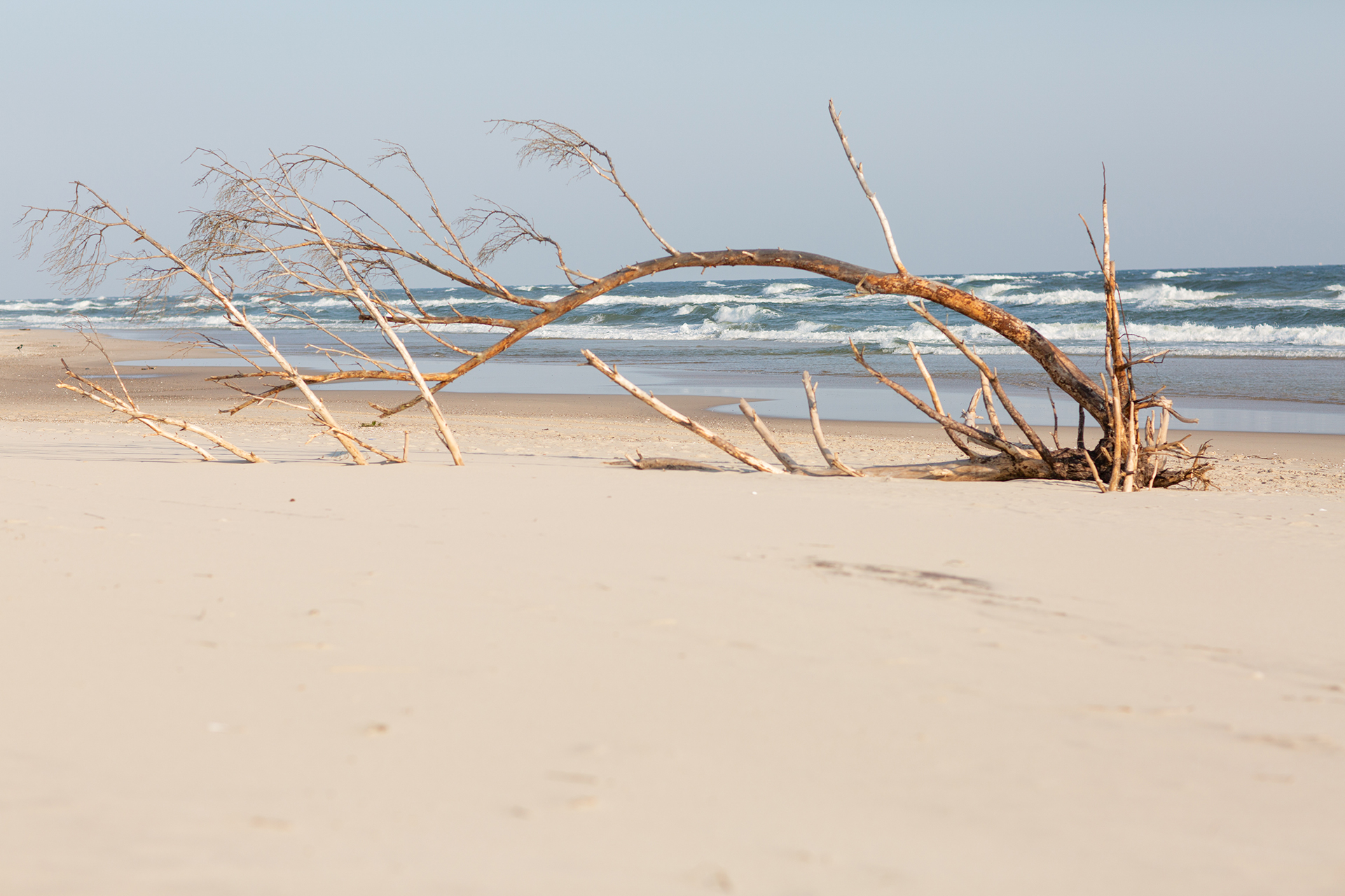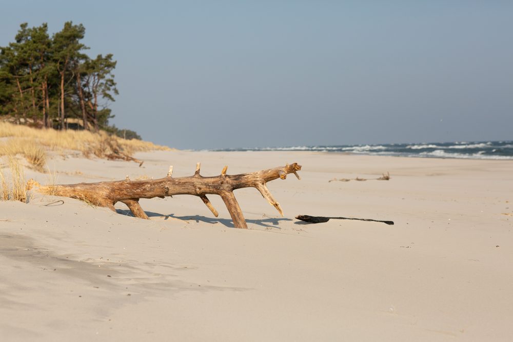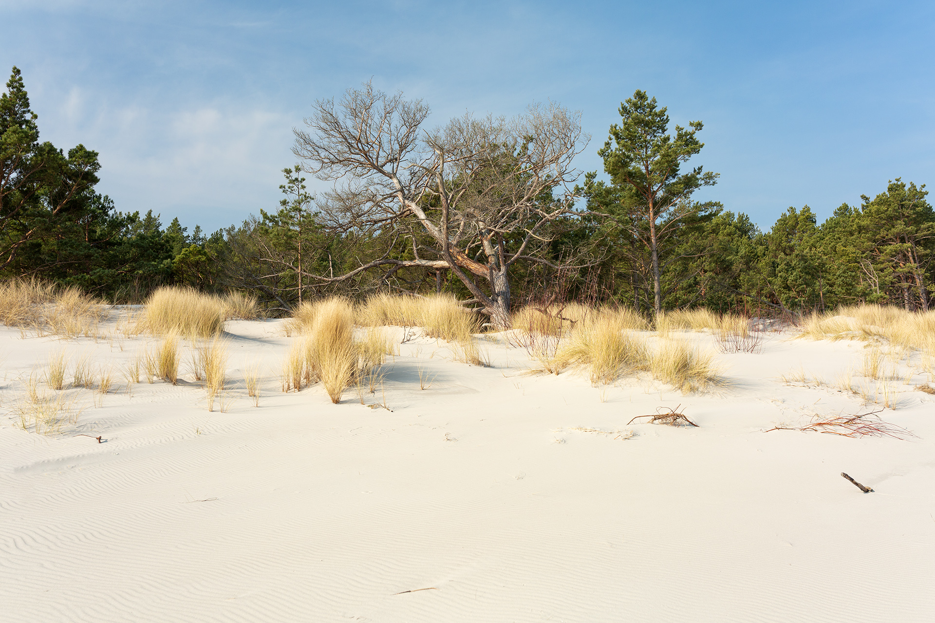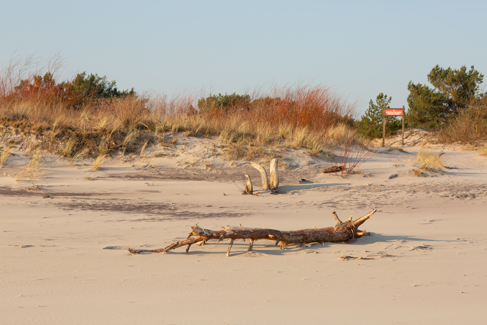 Natomiast będąc na Wydmach Helskich po raz drugi, zobaczyłem zupełnie inny krajobraz. Jak gdyby Bałtyk zechciał być bardziej litościwy dla otaczającej przyrody. Tym razem spokojny, dający pewien oddech. Pomyślałem sobie wówczas, że to jest właśnie tym, co sprawia, że chcę jak najczęściej podróżować, aby widzieć wszystkie oblicza morza i być świadkiem tych zjawisk, które za darmo funduje nam przyroda. Widok samotnych drzew, w tym również tych powalonych przez wiatr i wchłoniętych przez wydmy jest dla mnie metaforą przemijania. Z drugiej strony widziałem delikatną wydmuchrzycę piaskową, która potrafi być zasypywana przez „wędrujący” piach, ale potrafi przetrwać…Wspaniała metafora przetrwania i siły, nie zawsze tkwiącej w wielkości… Widziałem te źdźbła trawy z daleka na środku plaży i ten widok był dla mnie wzruszający.